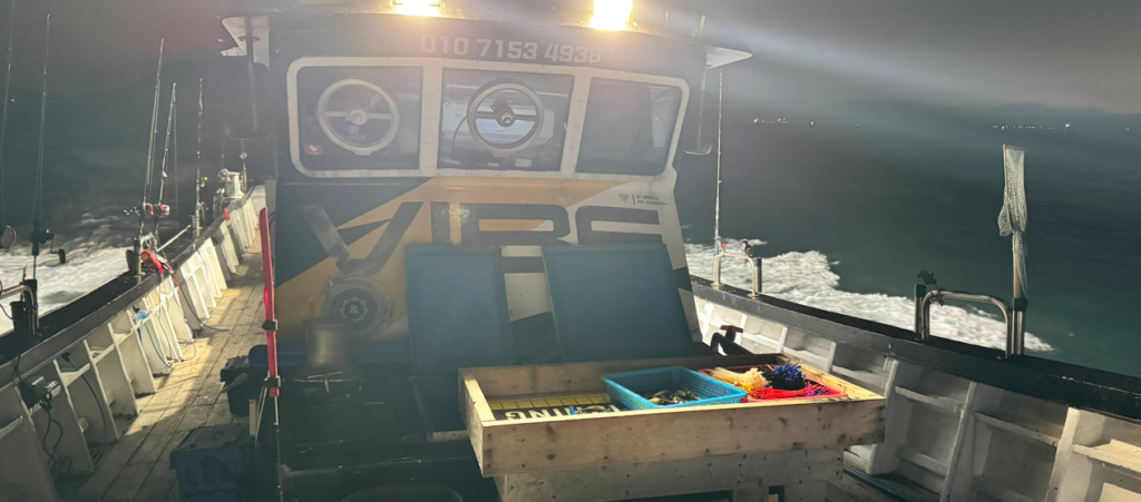바이브호는 정시에 출항했고, 점점 밝아지는 수평선을 보며 포인트로 향했습니다. 날씨는 맑았고 파도도 잔잔했으며, 겉으로 보기엔 최상의 조건이었지만 지깅에선 ‘물 흐름’이 핵심이라는 걸 다시 느끼게 되는 하루였습니다.