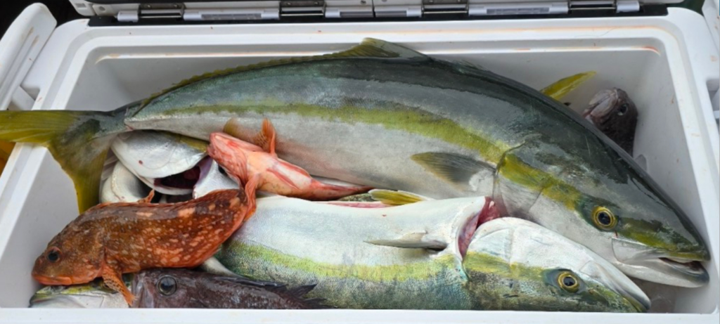 첫 캐스팅부터 느낌이 왔습니다. 바닥까지 지그가 너무 쉽게 떨어졌고, 액션을 넣어도 반응이 무기력했습니다. 물이 거의 흐르지 않는 상황. 그럼에도 몇몇 조사님들의 낚싯대가 크게 휘며 방어가 올라오기 시작했는데, 사이즈는 확실히 훌륭했습니다.
